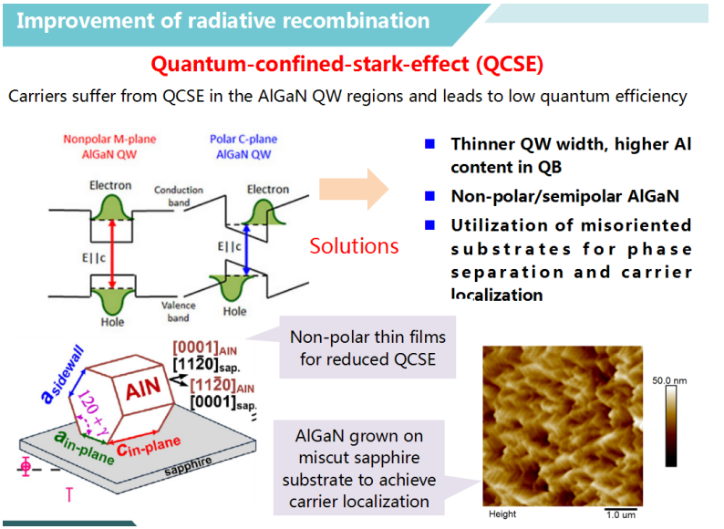 報告首先介紹團(tuán)隊在斜切角藍(lán)寶石襯底上外延AlGaN材料和紫外LED的進(jìn)展。通過采用高斜切角襯底,紫外LED的內(nèi)量子效率和發(fā)光功率明顯提升。這主要歸功于斜切角襯底促進(jìn)鋁和鎵的相分離,從而引起的載流子局域化效應(yīng)。