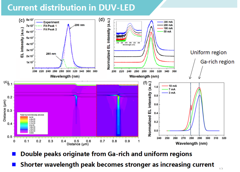 此外,研究中還證明了在電流注入條件下,載流子首先通過樣品的富鎵區(qū)域,器件開啟后則擴(kuò)展到整個有源區(qū)。實驗結(jié)果也得到了理論計算較好的支持,充分證明了斜切角襯底在提升紫外LED輻射復(fù)合效率方面的優(yōu)勢。