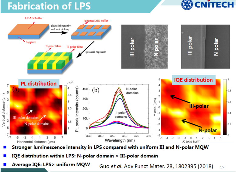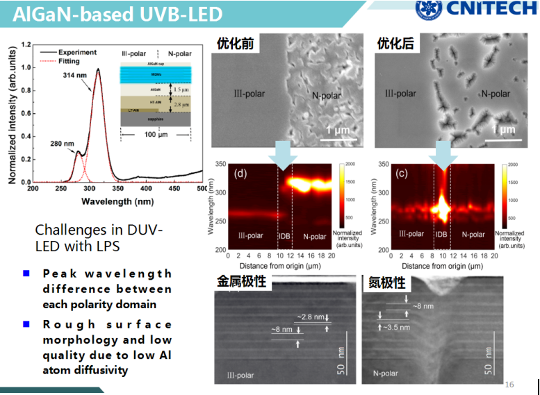 報告介紹了團(tuán)隊在橫向極性結(jié)構(gòu)紫外量子阱及LED的研究進(jìn)展。通過襯底上低溫結(jié)晶層的圖形化和預(yù)處理,得到了同時具有金屬極性和氮極性的“橫向極性結(jié)構(gòu)紫外LED”。構(gòu)建深紫外橫向極性結(jié)構(gòu)遇到的挑戰(zhàn)包括:高鋁組分AlGaN的三維形核生長導(dǎo)致氮極性、橫向極性結(jié)構(gòu)的質(zhì)量惡化,以及在極性反轉(zhuǎn)疇附近因AlGaN薄膜中Ga原子的橫向擴(kuò)散導(dǎo)致的金屬極性和氮極性發(fā)光波長的分離。
