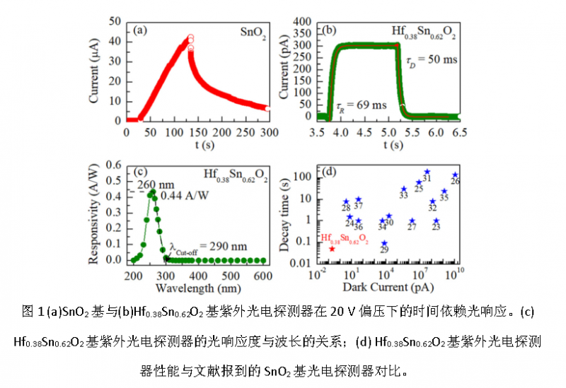 該工作通過Hf摻雜SnO2不僅拓寬了其帶隙,而且降低了其背景載流子濃度,極大提升了光電響應速度,為實現(xiàn)日盲紫外光探測器并拓展其在超寬禁帶半導體器件方面的應用有著十分重要的意義。