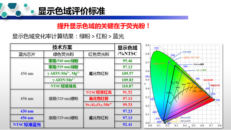 當前我國已成為我國已發(fā)展成為全球最大液晶顯示生產和消費市場,超高色域液晶顯示技術是主流發(fā)展趨勢,LED背光源決定了液晶顯示技術的色彩顯示及顯示色域,而提升顯示色域的關鍵在于熒光粉。