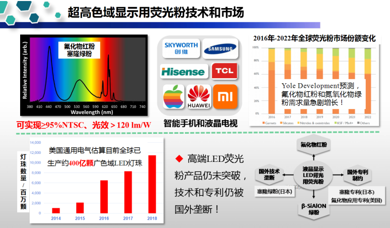 劉榮輝指出超高色域顯示是新型顯示技術的發(fā)展方向之一,基于LED背光源的液晶顯示技術仍具極好的發(fā)展前景,而開發(fā)更高色純度的熒光粉是實現(xiàn)這一技術的重要途徑。他認為未來超高色域液晶顯示發(fā)展進程中,中國企業(yè)有占據材料、專利和技術先機的重要機遇。