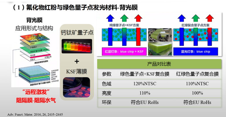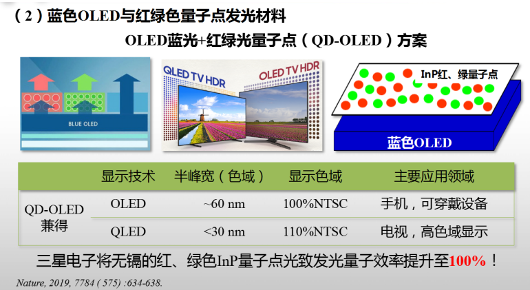 超高色域顯示技術領域,新型顯示技術也在有機融合,比如氟化物紅粉與綠色量子點發(fā)光材料-背光膜;藍色OLED與紅綠色量子點發(fā)光材料。