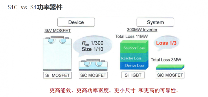 一代材料決定一代器件,碳化硅材料具有禁帶寬度越大,其熱學(xué)本征激發(fā)需要溫度越高,無需額外散熱裝置,減小整機體積等特質(zhì)。