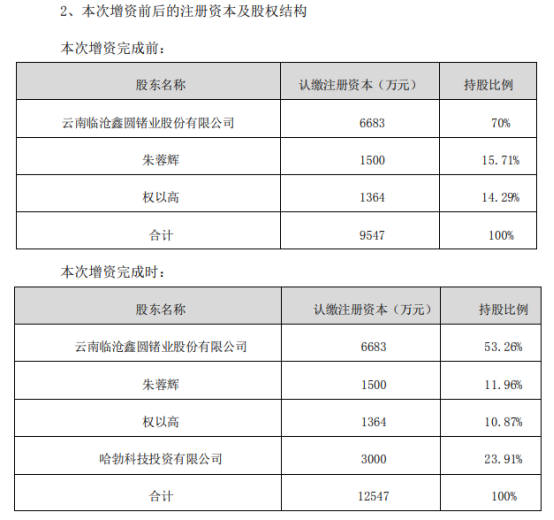 本次增資前,鑫耀半導(dǎo)體的股權(quán)結(jié)構(gòu)為:云南鍺業(yè)持股70%、朱蓉輝持股15.71%、權(quán)以高持股14.29%;本次增資完成后,鑫耀半導(dǎo)體的股權(quán)結(jié)構(gòu)為:云南鍺業(yè)持股53.26%、哈勃科技持股23.91%、朱蓉輝持股11.96%、權(quán)以高持股10.87%。增資完成后,云南鍺業(yè)仍為鑫耀半導(dǎo)體控股股東,仍保持對鑫耀半導(dǎo)體的實際控制權(quán)。