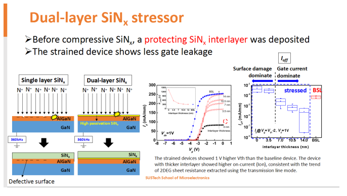 為了減少表面泄漏和反向柵極注入,開發(fā)了帶有應(yīng)力填充層的雙層SiNx鈍化層。低損傷夾層為半導(dǎo)體表面提供足夠的鈍化,減少表面泄漏。在鈍化層上,施加應(yīng)力填充層以在柵極區(qū)域產(chǎn)生額外的壓縮,從而減小阻擋層中的內(nèi)部電場(chǎng)。減小的電場(chǎng)抑制了F-N隧穿,從而減少了反向柵注入。