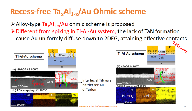 GaN-HEMTs為射頻功率放大器(PA)的應(yīng)用帶來(lái)了前所未有的性能。與Si基或GaAs基器件相比,GaN基HEMTs具有更高的輸出功率密度和更高的頻率,是5G基站的理想功率放大器選擇。報(bào)告中從歐姆接觸、鈍化層、柵結(jié)構(gòu)三個(gè)方面介紹了在高性能GaN RF HEMT方面的最新技術(shù)進(jìn)展。提出了一種新的合金歐姆金屬方案,具有超低的接觸電阻率(~0.1Ω?mm)和無(wú)凹槽工藝。與傳統(tǒng)的逐層Ti/Al基或Ta/Al基方案相比,濺射TixAl1-x或TayAl1-y合金層可以改善歐姆退火過(guò)程中AlGaN層中N空位的形成,從而降低接觸電阻率。