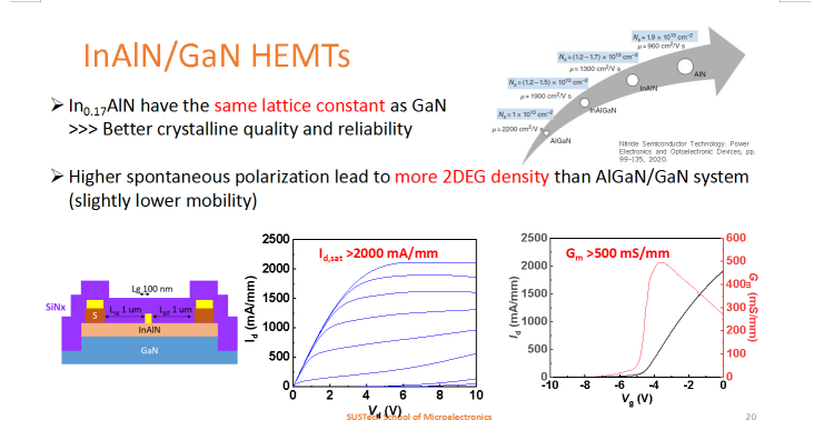 報(bào)告指出,采用高頻活化法沉積的PECVD-SiNx可以避免離子轟擊,獲得良好的鈍化效果。應(yīng)力襯層可以抑制肖特基柵F-N隧穿,減少柵漏。InAlN/GaN-HEMT優(yōu)良的飽和電流和跨導(dǎo)特性顯示出它在更好的射頻放大器應(yīng)用中的潛力。