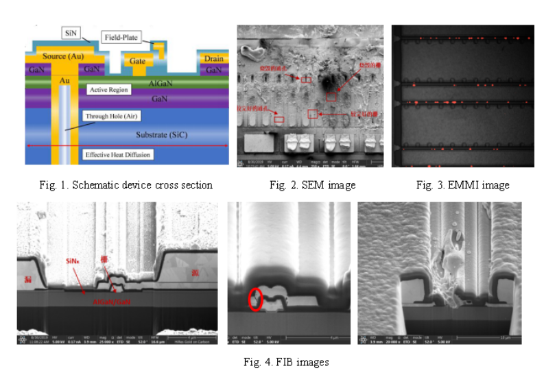 研究對5G基站應用中失敗的GaN-HEMTs進行了表征和分析。在失效后分析過程中使用了EMMI、SEM、FIB、EDS、TEM和TCAD模擬。發(fā)現(xiàn)門極FPs中存在裂紋,可能導致現(xiàn)場電場峰值,最終導致在正常運行過程中觀察到的災難性失效。