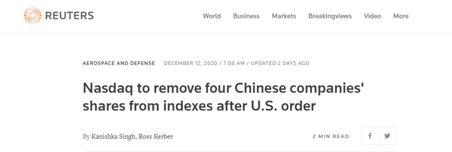 據(jù)路透社12月11日消息,納斯達(dá)克(Nasdaq)在一份聲明中稱,應(yīng)美國(guó)政府11月發(fā)布的美國(guó)投資者不得交易部分中國(guó)企業(yè)股票的指令,從其指數(shù)中移除四家中國(guó)公司。