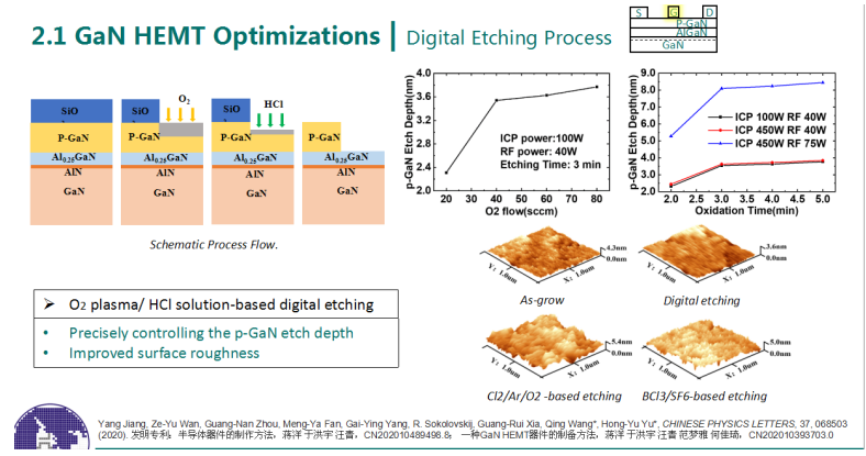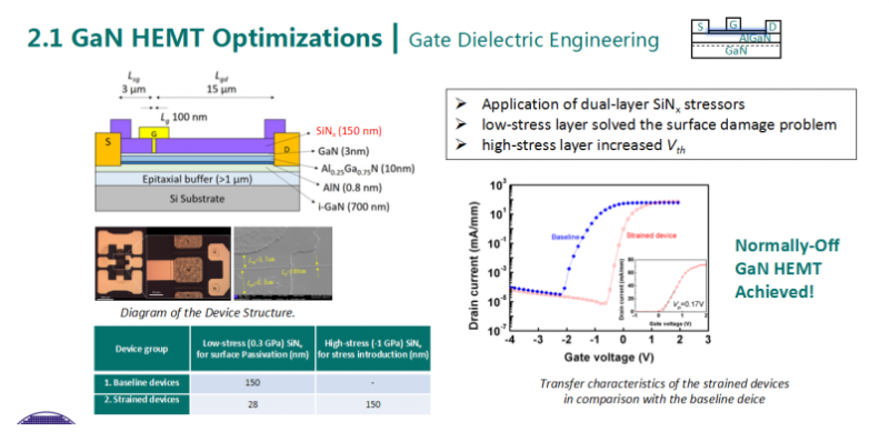近年來,研究在GaN功率器件和射頻器件領域取得了一系列研究成果:開發(fā)了多種刻蝕及歐姆接觸工藝,實現(xiàn)了世界最低的無金歐姆接觸電阻0.063Ω·mm,相關成果在IEEE Electron Device Letters(IEEE Electr. Device. L. 41, 1, 2020)發(fā)表,并被遴選為當期封面文章;創(chuàng)新性地引入石墨烯復合柵,在增大HEMT閾值電壓穩(wěn)定性的同時,有效減少漏電并提高柵極擊穿電壓(>12V),這一數(shù)值目前為國內(nèi)外文獻報道中關于p-GaN HEMT器件柵極擊穿電壓的最高水平,該成果發(fā)表于IEEE Transactions on Electron Devices(IEEE T. Electron. Dev. 67, 3, 2020);通過雙氮化硅應力層調(diào)節(jié)勢壘層極化強度,制備了具有優(yōu)良輸出特性的常關型GaN基HEMT器件,并引入梳狀柵極,有效抑制了短溝道效應,相關研究成果發(fā)表于Semiconductor Science and Technology(Semicond. Sci. Tech. 35, 4, 2020),并被國際著名半導體行業(yè)媒體 Semiconductor Today特約報道。