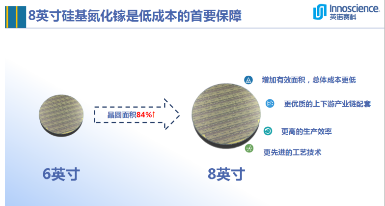 期間,由廣東芯聚能半導體有限公司,中電化合物半導體有限公司,英諾賽科(珠海)科技有限公司共同協(xié)辦的功率電子器件及封裝技術分會上,英諾賽科(珠海)科技有限公司工藝制程開發(fā)總監(jiān)謝文元分享了八英寸硅基氮化鎵產(chǎn)業(yè)化進展。