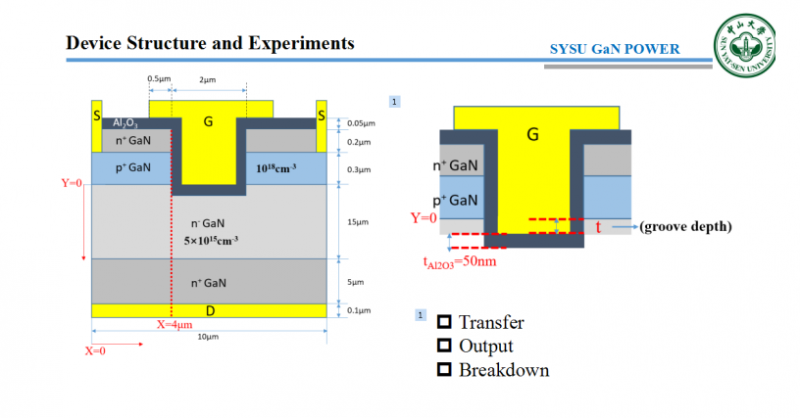 期間,由廣東芯聚能半導(dǎo)體有限公司,中電化合物半導(dǎo)體有限公司,英諾賽科(珠海)科技有限公司共同協(xié)辦的功率電子器件及封裝技術(shù)分會(huì)上,中山大學(xué)黎城朗分享凹槽深度對GaN槽柵型縱向?qū)ňw管電學(xué)特性的影響研究的最新進(jìn)展。