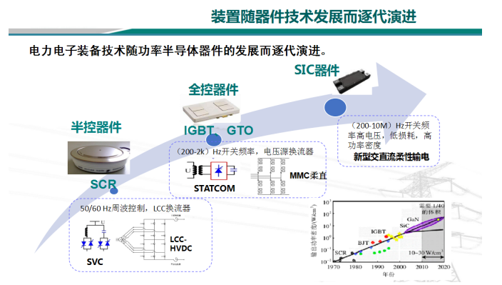 電力電子裝備技術(shù)隨功率半導(dǎo)體器件的發(fā)展而逐代演進(jìn)。電網(wǎng)的柔性半導(dǎo)體化進(jìn)程取決于器件發(fā)展水平,硅基器件固有的耐壓低,電流密度低,頻率低的弱點(diǎn),導(dǎo)致裝置體積大,重量大,功率密度低,限制了電力電子裝備的普遍應(yīng)用。