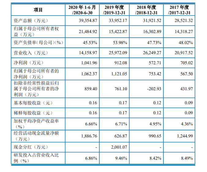 2017年度、2018年度、2019年度、2020年1-6月,宏微科技實(shí)現(xiàn)營(yíng)收分別為2.09億元、2.62億元、2.60億元、1.42億元;實(shí)現(xiàn)歸母凈利潤(rùn)分別為567.50萬(wàn)元、753.42萬(wàn)元、1121.05萬(wàn)元、1062.37萬(wàn)元;研發(fā)投入占營(yíng)收比例分別為8.49%、8.42%、9.46%、6.86%。