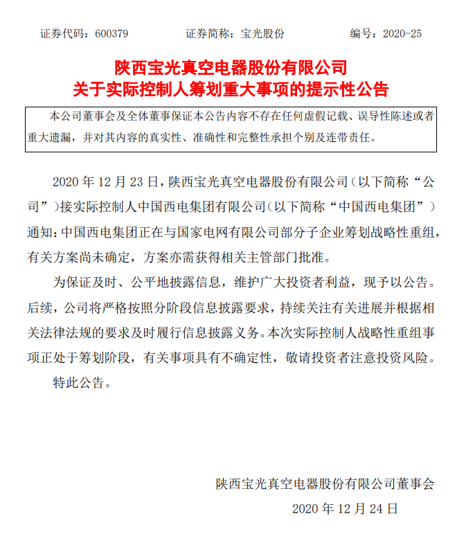 12月23日,陜西寶光真空電器股份有限公司(以下簡稱“公司”)接實(shí)際控制人中國西電集團(tuán)有限公司(以下簡稱“中國西電集團(tuán)”)通知:中國西電集團(tuán)正在與國家電網(wǎng)有限公司部分子企業(yè)籌劃戰(zhàn)略性重組,有關(guān)方案尚未確定,方案亦需獲得相關(guān)主管部門批準(zhǔn)。