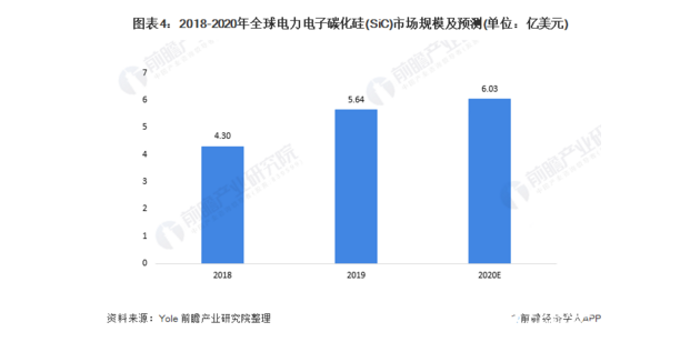 從下游需求情況來看,2018-2019年,受新能源汽車、工業(yè)電源等應用的推動,全球電力電子碳化硅的市場規(guī)模從4.3億美元增長至5.64美元,Yole預測未來市場仍將因新能源汽車產(chǎn)業(yè)的發(fā)展而增長,預計2020年的市場規(guī)模將達6億美元。