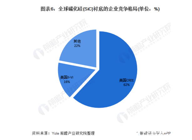 從全球碳化硅(SiC)襯底的企業(yè)進行情況來看,2018年,美國CREE公司占龍頭地位,市場份額達62%,其次是美國II-VI公司,市場份額約為16%??傮w來看,在碳化硅市場中,美國廠商占據(jù)主要地位。