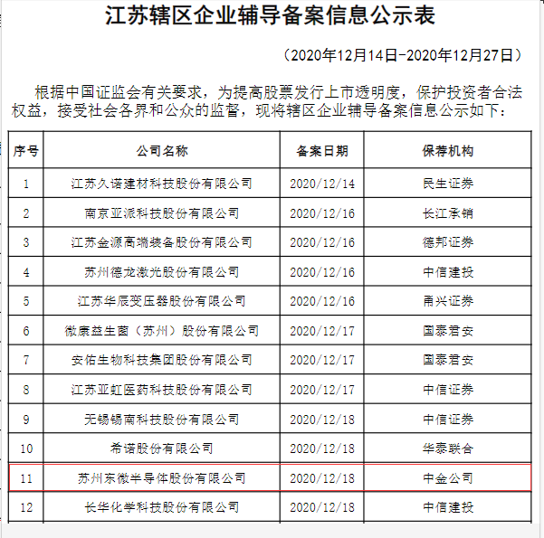 近日,江蘇監(jiān)管局披露了蘇州東微半導(dǎo)體股份有限公司(以下簡稱:東微半導(dǎo)體)輔導(dǎo)備案信息。其保薦機構(gòu)為中金公司,已于2020年12月18日進行上市輔導(dǎo)備案。
