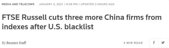 據(jù)路透社1月5日報道,英國知名指數(shù)公司富時羅素(FTSE Russell)表示,根據(jù)特朗普政府“禁止與被指有軍方背景的中資企業(yè)交易”的行政令指引,自周四起,富時全球股票指數(shù)和富時中國A股指數(shù)將刪除中國聯(lián)通、中芯國際和南京熊貓三家中企。
