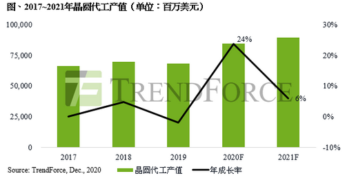 根據(jù)TrendForce集邦咨詢旗下半導(dǎo)體研究處表示,2020年上半年全球半導(dǎo)體產(chǎn)業(yè)受惠于疫情導(dǎo)致的恐慌性備料,以及遠(yuǎn)距辦公與教學(xué)的新生活常態(tài),下半年則因華為禁令的提前拉貨,與5G智能型手機(jī)滲透率提升及相關(guān)基礎(chǔ)建設(shè)需求強(qiáng)勁,預(yù)估2020年全球晶圓代工產(chǎn)值將達(dá)846億美元,年成長23.7%,成長幅度突破近十年高峰。