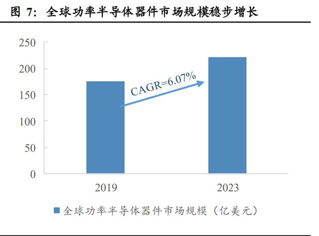 根據(jù)Yole數(shù)據(jù),2019年全球功率器件市場規(guī)模為175億美元,中國產(chǎn)業(yè)信息網(wǎng)預(yù)計到2023年達到221.5億美元,復(fù)合增長率為6.07%。