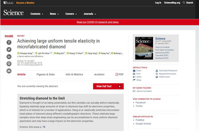 1月11日消息來自哈爾濱工業(yè)大學(xué)的韓杰才院士團隊,與香港城市大學(xué)、麻省理工學(xué)院等單位合作,在金剛石單晶領(lǐng)域取得重大科研突破。該項研究成果現(xiàn)已通過 “微納金剛石單晶的超大均勻拉伸彈性”為題在線發(fā)表于國際著名學(xué)術(shù)期刊《科學(xué)》。