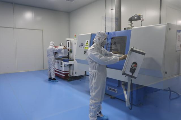 記者進(jìn)入生產(chǎn)車間,映入眼簾的是排列整齊的晶體生長(zhǎng)與襯底片加工設(shè)備,車間內(nèi)生產(chǎn)環(huán)境潔凈整潔、水、電、風(fēng)、氣等工藝管道排列整齊。走近設(shè)備,看到的是設(shè)備自動(dòng)控制屏上,各種變換的工藝參數(shù),技術(shù)人員在有條不紊的進(jìn)行著設(shè)備操作。