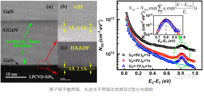 最終在LPCVD-SiNx和GaN之間實(shí)現(xiàn)2.5-5埃米原子級(jí)平整界面,界面態(tài)密度在ET=30 meV下約1.5×1013 cm-2eV-1,ET=1 eV下約4×1011~1.2×1012 cm-2eV-1水平。