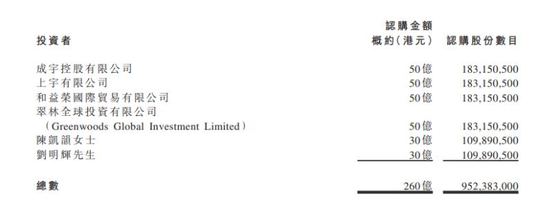 公開資料顯示,成宇控股有限公司出資50億港元,實(shí)際控制人為京基集團(tuán)創(chuàng)始人陳華。上宇有限公司出資50億港元,實(shí)際控制人為內(nèi)地房地產(chǎn)開發(fā)商中洲集團(tuán)創(chuàng)始人黃光苗;和益榮國(guó)際貿(mào)易有限公司出資50億港元,實(shí)際控制人為王開國(guó),該公司主要從事貿(mào)易及投資,包括大宗貿(mào)易及私募股權(quán)和公開市場(chǎng)投資;翠林全球投資有限公司出資50億港元,實(shí)際控制人為翠林集團(tuán)董事長(zhǎng)王忠明。