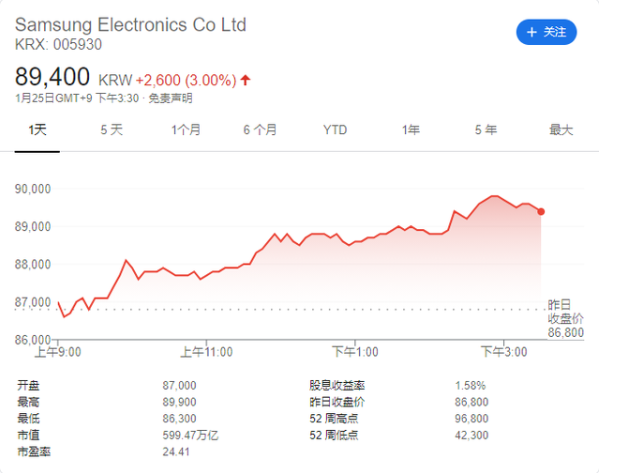 三星電子股價(005930.KS)在1月25日當(dāng)天交易中上漲了3%。(圖片來源:谷歌財(cái)經(jīng))