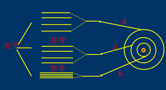 正因?yàn)樵谄渌拥挠绊懴?,能?jí)分裂成了能帶。當(dāng)原子周期性排列形成晶體互相靠近時(shí),每一個(gè)能級(jí)都分裂為很多彼此相距很近的能級(jí),形成能帶。
