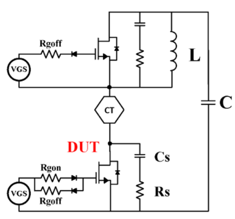 雙脈沖測(cè)試(DPT)證明了RC緩沖器的有效性。它是帶有感性負(fù)載的半橋。橋的高邊和低邊都使用相同的器件,在低邊測(cè)量了VGS,VDS和ID(圖2)。電流互感器(CT)同時(shí)測(cè)量設(shè)備和緩沖電流。因此,測(cè)得的總開(kāi)關(guān)損耗包括器件損耗和緩沖損耗。