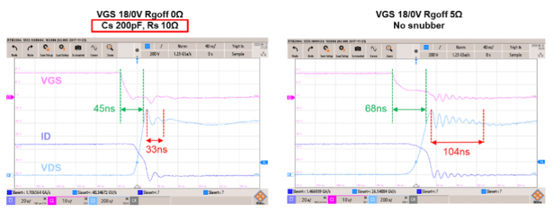 在圖3中,比較了圖1中相同設(shè)備的關(guān)閉狀態(tài)。左波形使用具有低RG(關(guān))的RC緩沖器,而右波形具有高RG(關(guān))且無(wú)緩沖器。兩種方法都限制了關(guān)斷峰值尖峰漏極——源極電壓VDS。但是,通過(guò)將振鈴時(shí)間減少到僅33ns,緩沖電路更加有效,并且延遲時(shí)間也更短。