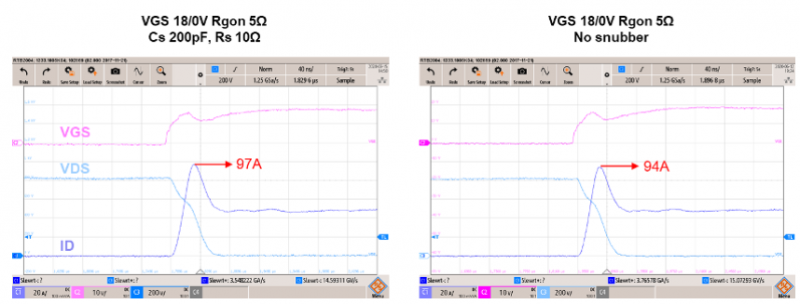 圖4比較了帶有RC緩沖器(左)和不帶有RC緩沖器的5ΩRG(開(kāi))下的波形。 RC緩沖器的導(dǎo)通波形具有稍高的反向恢復(fù)峰值電流(Irr),但沒(méi)有其他明顯的差異。
