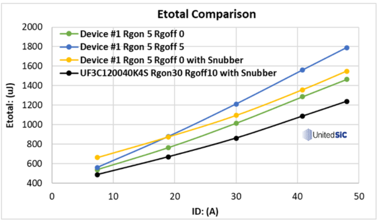 為了更好地理解整體效率,將Eoff和Eon一起添加了Etotal(圖6)。全速切換時(shí),緩沖器在18A以上時(shí)效率更高。對(duì)于以40A / 40kHz開(kāi)關(guān)的40mΩ器件,使用RC緩沖器的高和低RG(關(guān))之間的損耗差為11W。總之,與使用高RG(關(guān))相比,緩沖器是一種將EMI和開(kāi)關(guān)損耗降至最低的更簡(jiǎn)單,更有效的方法。