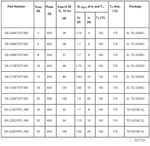 例如, Vishay最近發(fā)布了新型高效SiC肖特基二極管。該公司發(fā)布了10種全新的SiC二極管,所有這些二極管均可承受650 V的VRRM和4 A至40 A的正向電流。這些新型二極管的額定承受的最高結(jié)溫為175°C, 允許在非常高的溫度環(huán)境中工作--這對從事某些電力電子領(lǐng)域工作的設(shè)計(jì)人員來說至關(guān)重要。