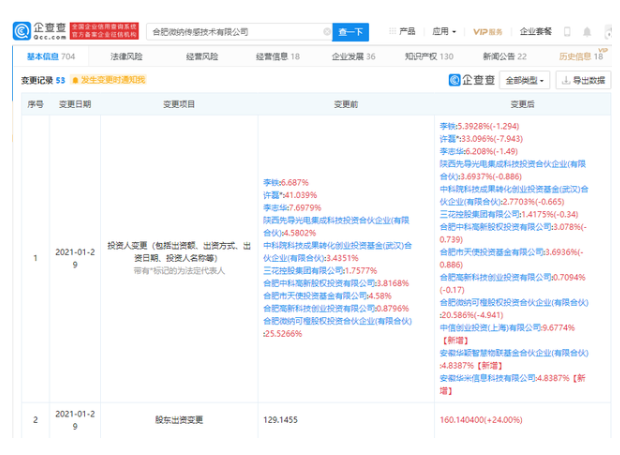 1月29日,合肥微納傳感技術(shù)有限公司發(fā)生工商變更,新增股東安徽華米信息科技有限公司等,同時(shí)公司注冊資本由129.15萬元人民幣增加至 160.14萬元人民幣,增幅為24%。