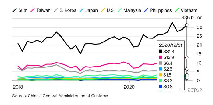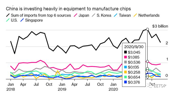 彭博社對(duì)官方貿(mào)易數(shù)據(jù)的分析顯示,中國企業(yè)從日本、韓國、中國臺(tái)灣等地購買了近320億美元的用于生產(chǎn)芯片的半導(dǎo)體設(shè)備,比2019年猛增20%。