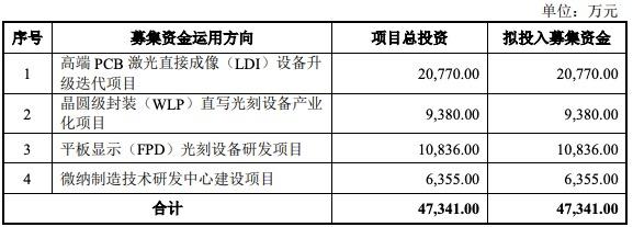 申報稿顯示,芯碁微裝擬募集資金4.73億元,其中,2.08億元用于高端PCB激光直接成像(LDI)設備升級迭代項目;9380.00萬元用于晶圓級封裝(WLP)直寫光刻設備產業(yè)化項目;1.08億元用于平板顯示(FPD)光刻設備研發(fā)項目;6355.00萬元用于微納制造技術研發(fā)中心建設項目。