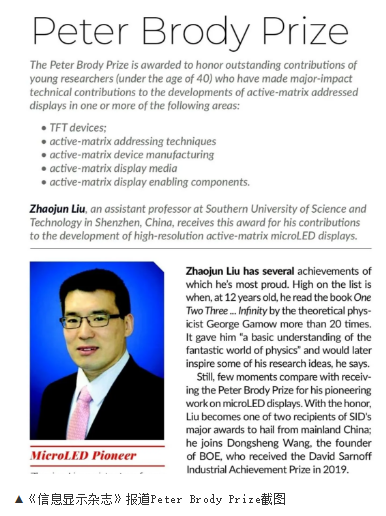 思坦科技創(chuàng)始人劉召軍博士于2020年被授予此獎,以表彰其在高分辨率有源選址Micro-LED顯示領(lǐng)域的貢獻?!缎畔@示雜志》在報道2020年的Peter Brody Prize時,給其定位為“Micro-LED Pioneer”。