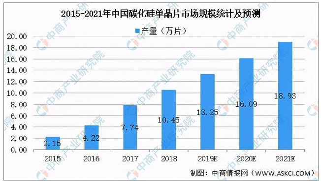碳化硅晶片是以高純硅粉和高純碳粉作為原材料,采用物理氣相傳輸法(PVT)生長碳化硅晶體,加工制成碳化硅晶片。2018年國內(nèi)碳化硅單晶片產(chǎn)能超過19萬片,行業(yè)產(chǎn)量約10.45萬片,隨著下游市場的需求不斷擴大,預(yù)計在2021年行業(yè)產(chǎn)量可達18.93萬片。