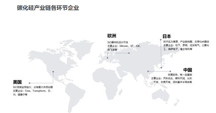 在全球市場中,單晶襯底企業(yè)主要有Cree、DowCorning、SiCrystal、II-VI、新日鐵住金、Norstel等,外延片企業(yè)主要有DowCorning、II-VI、Norstel、Cree、羅姆、三菱電機、Infineon等,器件方面,全球大部分市場份額被Infineon、Cree、羅姆、意法半導(dǎo)體等少數(shù)企業(yè)瓜分。
