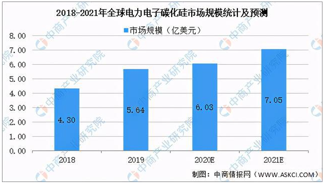 2018-2019年,受新能源汽車、工業(yè)電源等應(yīng)用的推動,全球電力電子碳化硅的市場規(guī)模從4.3億美元增長至5.64美元,中商產(chǎn)業(yè)研究院預(yù)測未來市場仍將因新能源汽車產(chǎn)業(yè)的發(fā)展而增長,預(yù)計2021年的市場規(guī)模將達7億美元。