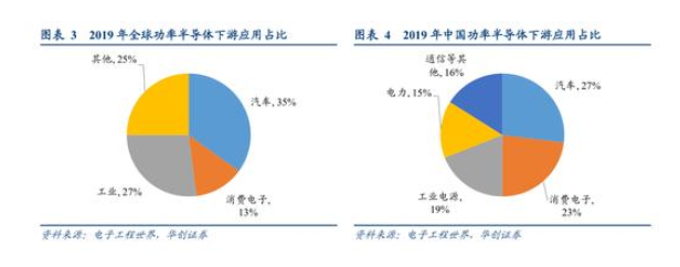根據(jù)電子工程世界數(shù)據(jù),全球范圍內(nèi)功率半導(dǎo)體下游領(lǐng)域中,汽車需求占比 35%、工業(yè)為27%、消費(fèi)電子為 13%,三者合計(jì) 75%;中國市場則按份額順序依次為汽車(27%)、消費(fèi)電子(23%)、工業(yè)電源(19%)、電力(15%)、通信及其他(16%)。