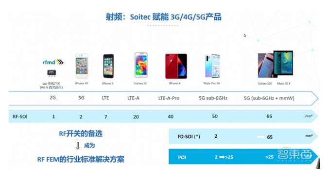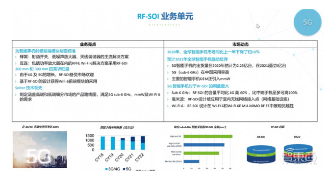 同時又可以看到RF-SOI在毫米波領(lǐng)域以及Wi-Fi 6領(lǐng)域的增長是在加快的。所以這里的RF-SOI覆蓋了很多領(lǐng)域,并且成為行業(yè)的標準。