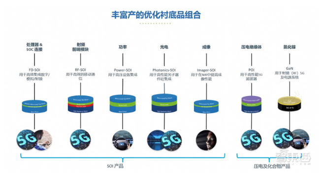 面向5G,Soitec主要提供RF-SOI、FD-SOI、Power-SOI、Photonics-SOI、Imager-SOI等襯底產(chǎn)品。在RF-SOI領(lǐng)域,Soitec用自己的RF-SOI技術(shù)為智能手機的射頻前端模塊設(shè)定了行業(yè)標準,有包括200毫米、300毫米這樣技術(shù)節(jié)點上的產(chǎn)品。