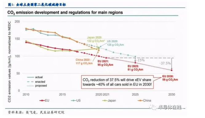 政策支持&節(jié)能減排驅動新能源汽車加速滲透。我國《新能源汽車產業(yè)發(fā)展規(guī)劃(2021— 2035 年)》提出新能源汽車發(fā)展愿景,計劃到 2025 年,國內新能源汽車滲透率達到 20%。國 際上,歐洲多國二氧化碳限排政策,新能源汽車補貼政策雙管齊下,以應對全球氣候變暖的壓 力,汽車電動化路線愈加明顯。在歐盟,ACEA 汽車溫室氣體排放協(xié)議規(guī)定,到 2030 年以前, 汽車二氧化碳排放量需低于每公里 59 克。根據英飛凌測算,歐盟新能源汽車滲透率將在 2030 達到 40%。