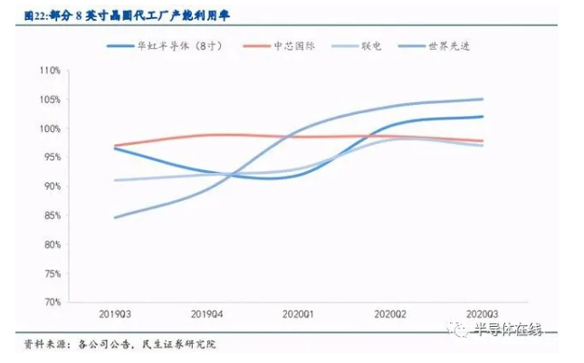 8 寸產能緊張,代工廠產能滿載。2020 年 5G 商用化、以及疫情“宅經濟”加速推動社 會數字化轉型,汽車、家電、數碼等終端設備市場景氣度持續(xù)回暖,大幅拉動了半導體需求 增長。此外,歐美疫情尚未得到完全控制,中美貿易關系前景不明朗等因素驅動芯片廠商提 高安全庫存,多重因素共振導致晶圓代工產能供不應求,各大晶圓代工廠商 8 英寸產能接 近滿載。世界先進,華虹宏力 2020Q3 產能利用率均超過 100%,聯(lián)電,中芯國際產能利 用率也處在 95%的高位附近。