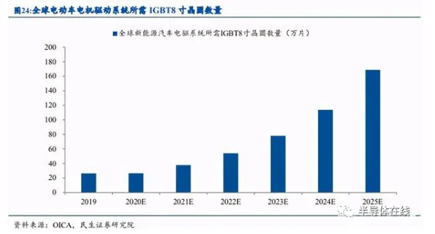 5G 商用以及疫情宅經濟加速推動社會數字化轉型,新能源車、家電、數碼等終端設備 市場景氣度轉暖,帶動半導體需求增長,疊加半導體廠商因供應鏈安全需要提高安全庫 存,多項因素共振導致半導體產能緊張,目前各大晶圓代工廠商均處于滿產狀態(tài)。從全 球來看,IC insight 預計 2021 年全球將新增 2080 萬片等效 8 寸晶圓產能,從國內來看, 在建的晶圓制造等效 8 寸產能約 2796 萬片/年,大部分集中在 2022 年投產。但考慮到 新產線投產后約有 3-5 年的產能爬坡期,短期內產能緊張較難緩解。受益于新能源汽車 和充電樁需求的快速提升,預計 2025 年全球僅車規(guī)級 IGBT 模塊所需的 8 寸晶圓量就 達 169 萬片,較 2020 年增長 5.4 倍,晶圓制造需求缺口巨大。年初以來海內外各大芯 片廠商紛紛上調產品價格或延長交期,預計半導體產業(yè)鏈景氣度仍將持續(xù)上升。
